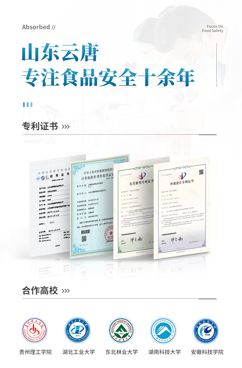山東云唐智能科技有限公司生產的果蔬肉類檢測儀,采用臺式一體化設計,可快速檢測幾十種項目,包含各種蔬菜水果中有機磷和氨基甲酸酯類農藥殘留,病害肉診斷:肉中組胺、揮發性鹽基氮;各種肉食品中瘦肉精激素類殘留、抗生素、獸藥殘留等現場的定性定量檢測。